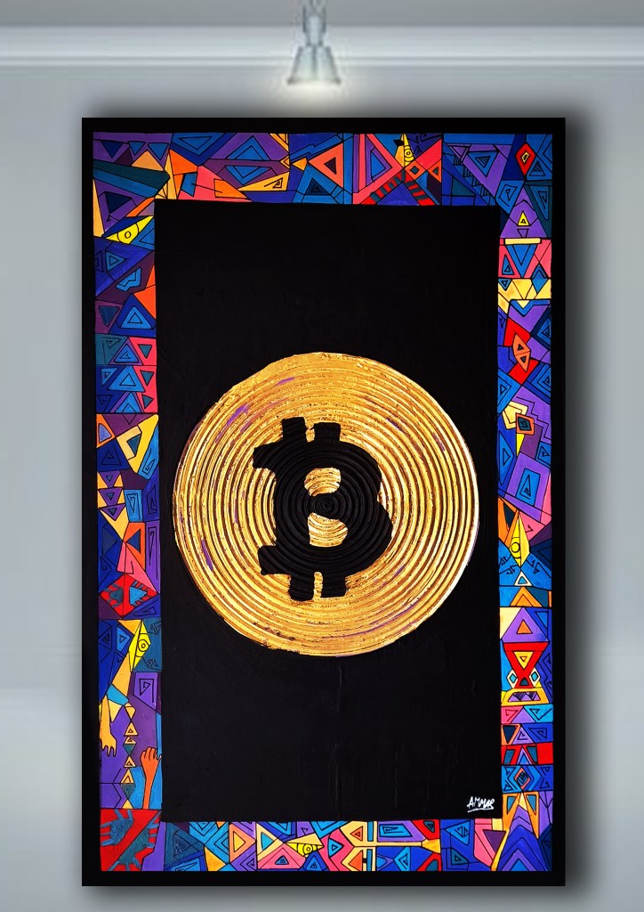 BITCOIN Tableau de peinture Acryliqueet feuille d’or sur toile , réalisé en 2018 , l’œuvre exposé à ATELIER 2080.