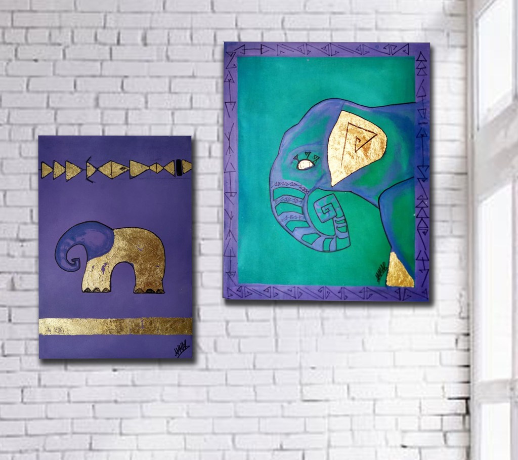 Gold Eléphants Tableau de peinture acrylique ( couleur D’Afrique ) , œuvre toile sur châssis en bois , le tableau exposé à ATELIER 2080.