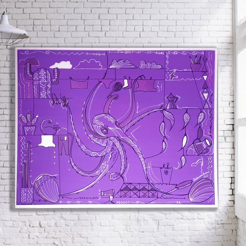 OCTOPUS Tableau de peinture acrylique sur toile le tableau encadré en bois ,exposé à la galerie du Palais Saint Croix Italien au Medina de TUNIS en 2021.
